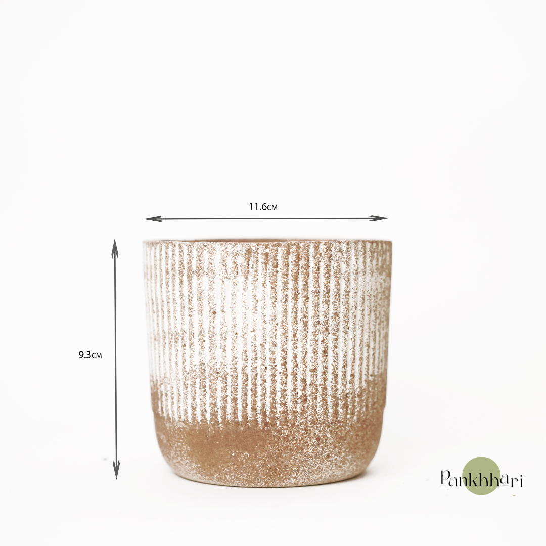 This minimalist planter features a ribbed texture with a subtle, earthy color gradient from soft white to natural terracotta. Its simple, modern design pairs well with a variety of home decor styles, offering a clean and understated aesthetic. Perfect for displaying small plants or succulents, this planter adds a touch of organic warmth to any indoor or outdoor space. Its durable construction ensures longevity, making it both stylish and practical.